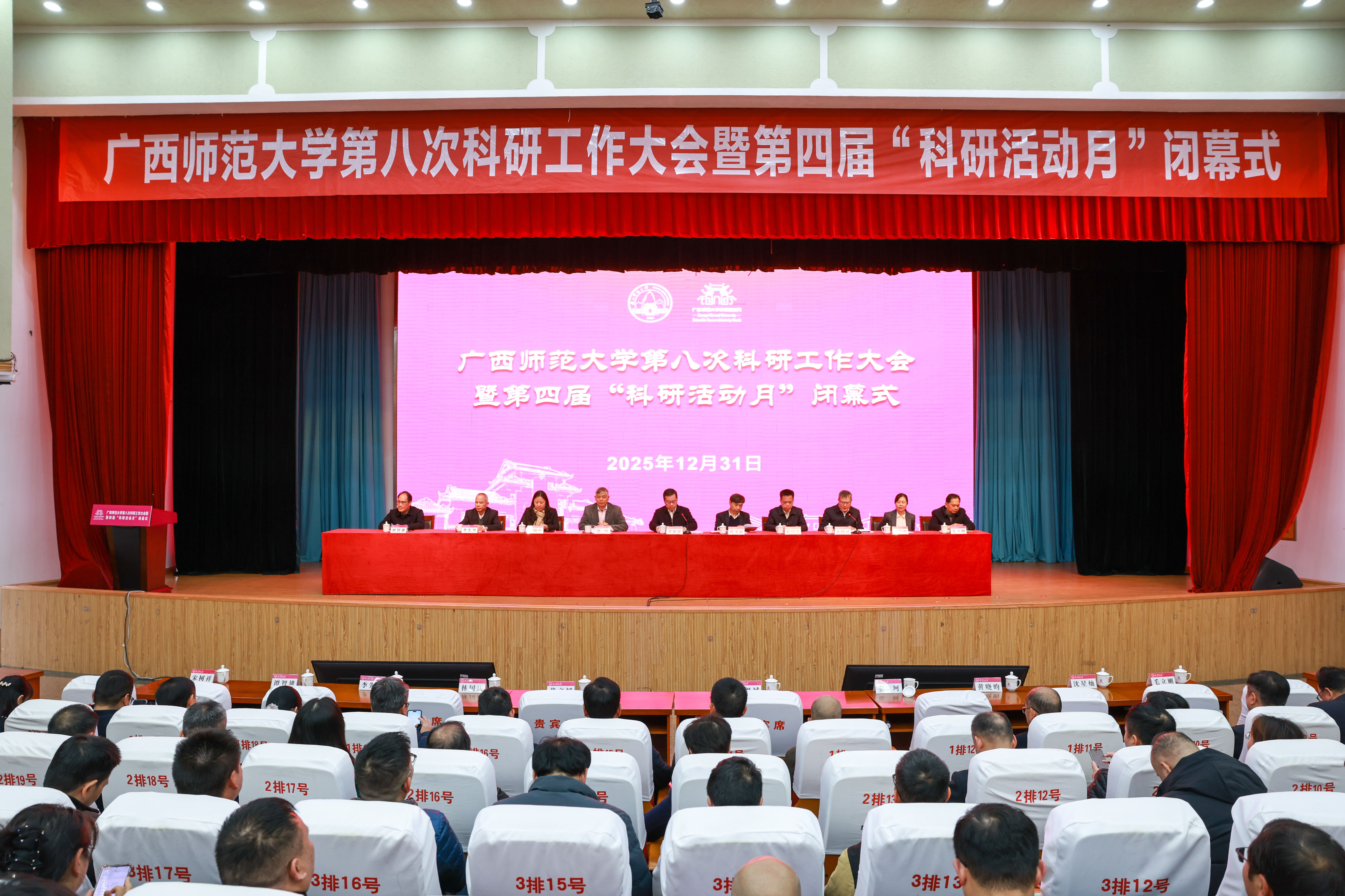 12月31日,广西师范大学第八次科研工作大会暨第四届“科研活动月”闭幕式在育才校区召开,会议由第八次科研工作大会及第四届“科研活动月”闭幕式两个环节组成。自治区教育厅二级巡视员、科研管理处处长黄青云受邀出席会议并致辞,校领导贺祖斌、孙杰远、黄文韬、莫坷、林国庆、黄晓昀、宋树祥、李先贤、沈星灿,校党委常委谭智雄、毛立刚出席会议。大会和闭幕式由校党委常委、副校长宋树祥主持。